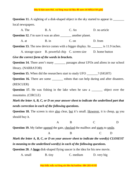 Question 20. A huge disk-shaped flying saucer is the idea for his new movie. A. small B. tiny C. medium D. very big
