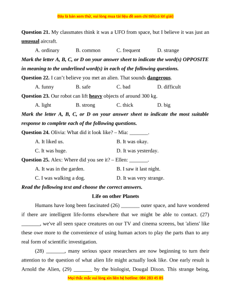 Question 21. My classmates think it was a UFO from space, but I believe it was just an unusual aircraft. A. ordinary B. common C. frequent D. strange