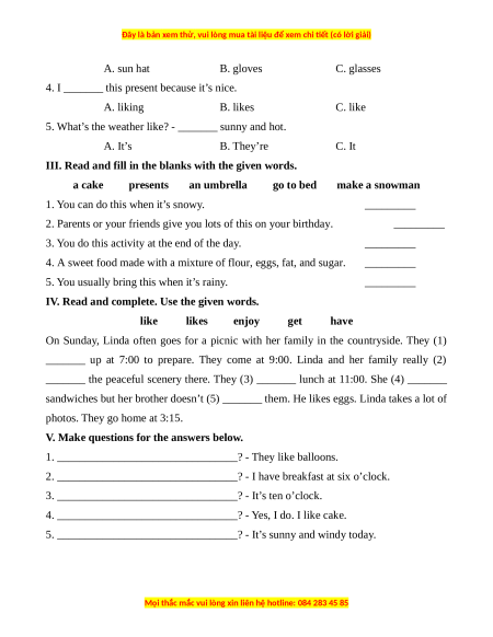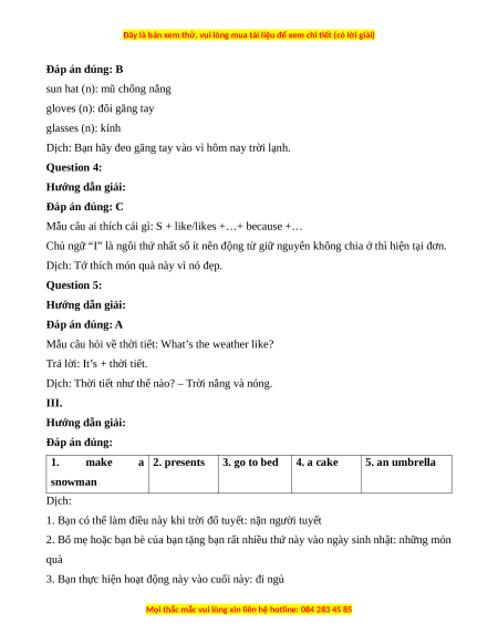 Dịch: Thời tiết như thế nào? – Trời nắng và nóng. III. Hướng dẫn giải: Đáp án đúng: 1. make a 2. presents 3. go to bed 4. a cake 5. an umbrella snowman Dịch: