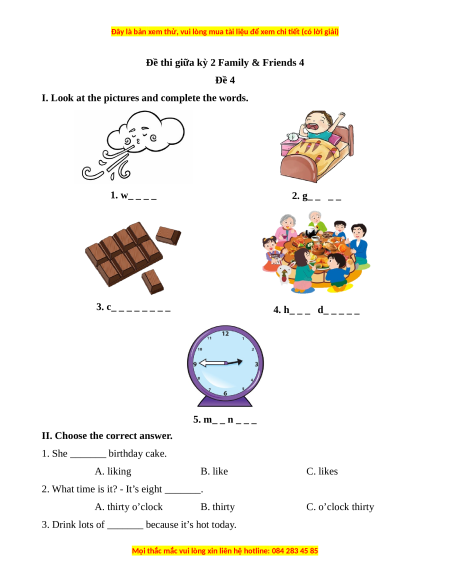 Đề thi giữa kỳ 2 Family & Friends 4 Đề 4