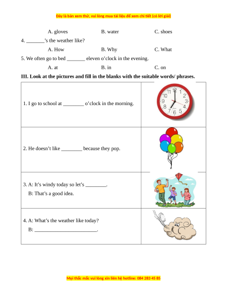 III. Look at the pictures and fill in the blanks with the suitable words/ phrases.
