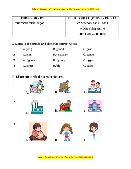 I. Listen to the sounds and circle the correct words. 1. A. long B. round C. farm 2. A. slim B. television C. centre 3. A. farmer B. factory C. nurse 4. A. street B. big C. quiet