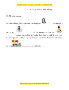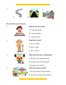III. Circle the correct answers. 1. What do you do at noon? A. I wash the clothes. B. I wash the dishes. C. I clean the floor. 2. What does Lan do? A. She’s a farmer. B. She’s a nurse. C. She’s a doctor. 3.