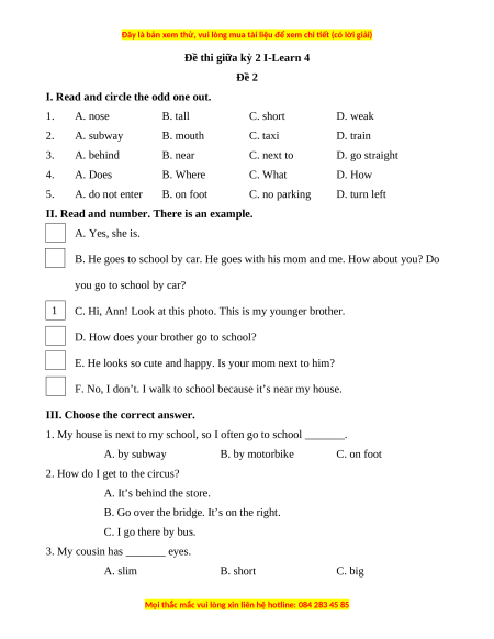 I. Read and circle the odd one out. 1. A. nose B. tall C. short D. weak 2. A. subway B. mouth C. taxi D. train 3. A. behind B. near C. next to D. go straight 4. A. Does B. Where C. What D. How 5. A. do not enter B. on foot C. no parking D. turn left