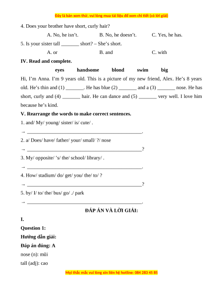 ĐÁP ÁN VÀ LỜI GIẢI: I. Question 1: Hướng dẫn giải: Đáp án đúng: A nose (n): mũi tall (adj): cao