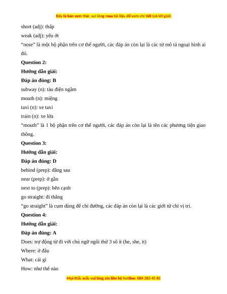 “mouth” là 1 bộ phận trên cơ thể người, các đáp án còn lại là tên các phương tiện giao thông. Question 3: Hướng dẫn giải: Đáp án đúng: D behind (prep): đằng sau near (prep): ở gần next to (prep): bên cạnh go straight: đi thẳng