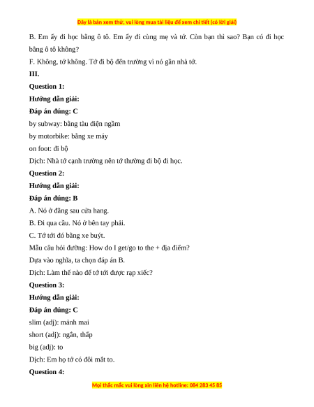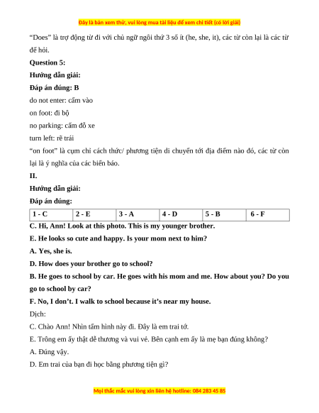 “Does” là trợ động từ đi với chủ ngữ ngôi thứ 3 số ít (he, she, it), các từ còn lại là các từ để hỏi. Question 5: Hướng dẫn giải: Đáp án đúng: B do not enter: cấm vào on foot: đi bộ no parking: cấm đỗ xe turn left: rẽ trái
