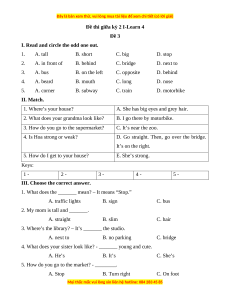 I. Read and circle the odd one out. 1. A. tall B. short C. big D. stop 2. A. in front of B. behind C. bridge D. next to 3. A. bus B. on the left C. opposite D. behind 4. A. beard B. mouth C. long D. nose 5. A. corner B. subway C. train D. motorbike II. Match. 1. Where’s your house?