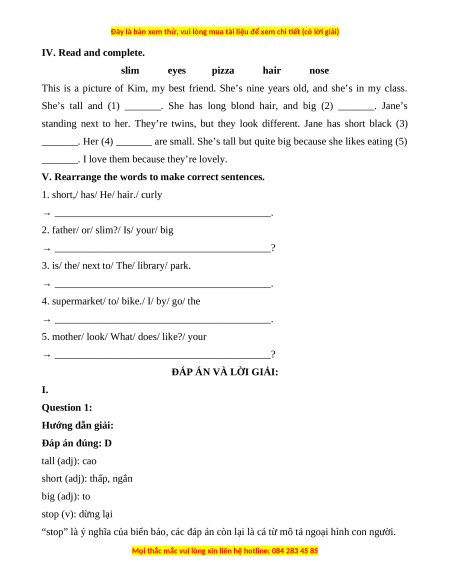 ĐÁP ÁN VÀ LỜI GIẢI: I. Question 1: Hướng dẫn giải: Đáp án đúng: D tall (adj): cao short (adj): thấp, ngắn big (adj): to stop (v): dừng lại