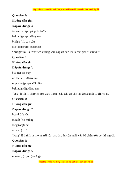 “bridge” là 1 sự vật trên đường, các đáp án còn lại là các giới từ chỉ vị trí. Question 3: Hướng dẫn giải: Đáp án đúng: A bus (n): xe buýt on the left: ở bên trái