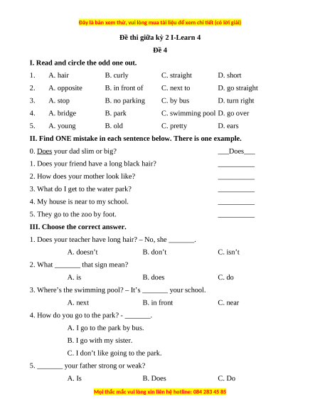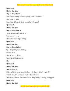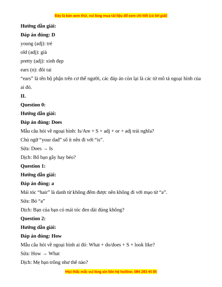 “ears” là tên bộ phận trên cơ thể người, các đáp án còn lại là các từ mô tả ngoại hình của ai đó. II. Question 0: Hướng dẫn giải: Đáp án đúng: Does
