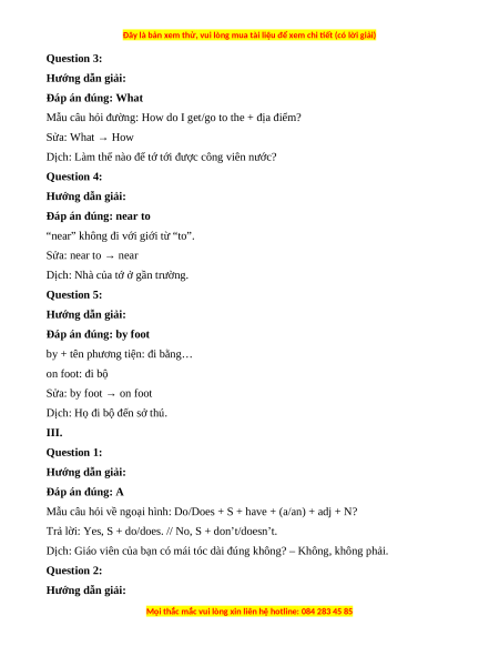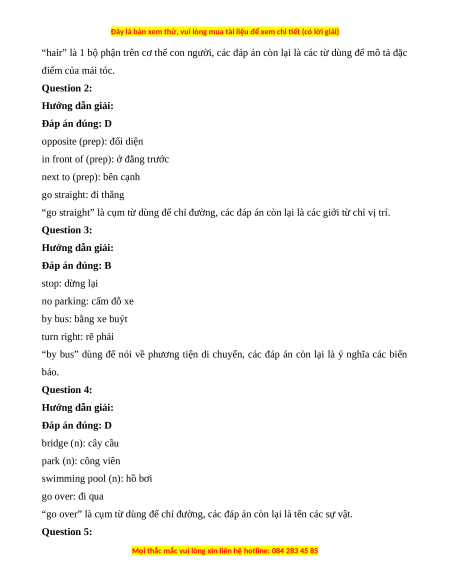 “go over” là cụm từ dùng để chỉ đường, các đáp án còn lại là tên các sự vật. Question 5: