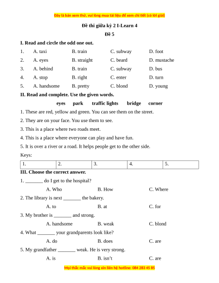 I. Read and circle the odd one out. 1. A. taxi B. train C. subway D. foot 2. A. eyes B. straight C. beard D. mustache 3. A. behind B. train C. subway D. bus 4. A. stop B. right C. enter D. turn 5. A. handsome B. pretty C. blond D. young