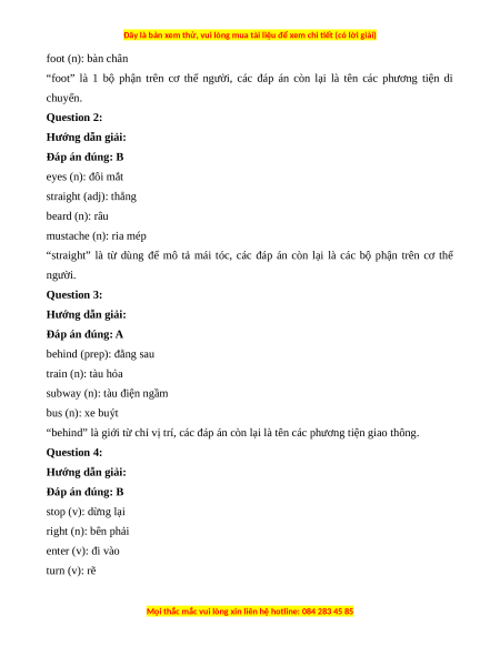“foot” là 1 bộ phận trên cơ thể người, các đáp án còn lại là tên các phương tiện di chuyển. Question 2: Hướng dẫn giải: Đáp án đúng: B eyes (n): đôi mắt straight (adj): thẳng beard (n): râu mustache (n): ria mép