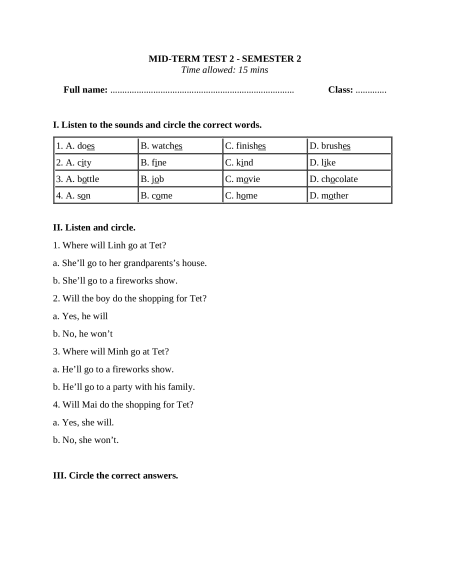 I. Listen to the sounds and circle the correct words. 1. A. does B. watches C. finishes D. brushes 2. A. city B. fine C. kind D. like 3. A. bottle B. job C. movie D. chocolate 4. A. son B. come C. home D. mother II. Listen and circle. 1. Where will Linh go at Tet?