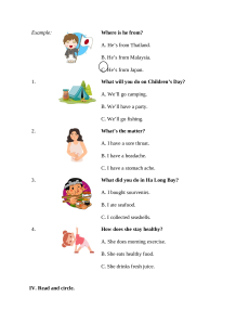 What will you do on Children’s Day? A. We’ll go camping. B. We’ll have a party. C. We’ll go fishing. 2. What’s the matter? A. I have a sore throat. B. I have a headache. C. I have a stomach ache. 3.