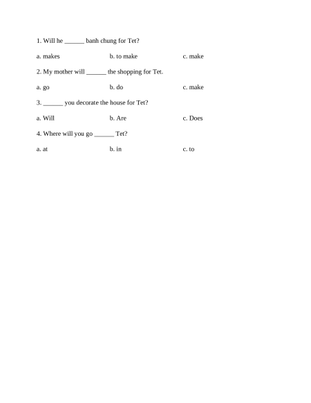 1. Will he ______ banh chung for Tet? a. makes b. to make c. make
