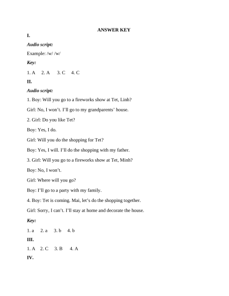 4. Where will you go ______ Tet? a. at b. in c. to ANSWER KEY I. Audio script: Example: /w/ /w/ Key: 1. A 2. A 3. C 4. C II. Audio script: