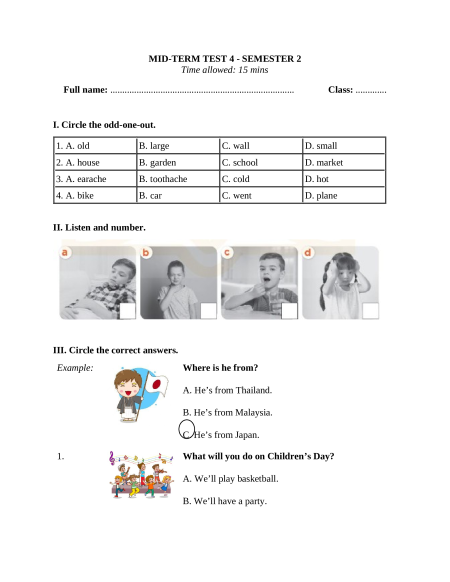 I. Circle the odd-one-out. 1. A. old B. large C. wall D. small 2. A. house B. garden C. school D. market 3. A. earache B. toothache C. cold D. hot 4. A. bike B. car C. went D. plane II. Listen and number.