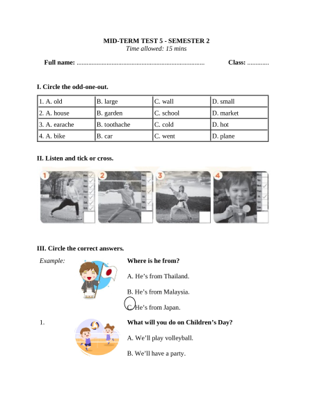 I. Circle the odd-one-out. 1. A. old B. large C. wall D. small 2. A. house B. garden C. school D. market 3. A. earache B. toothache C. cold D. hot 4. A. bike B. car C. went D. plane