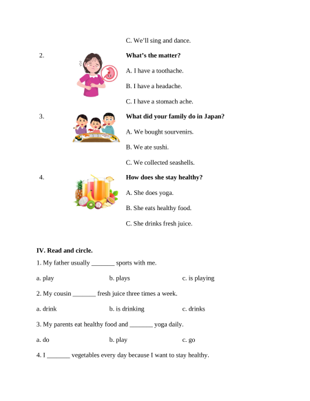 How does she stay healthy? A. She does yoga. B. She eats healthy food. C. She drinks fresh juice. IV. Read and circle.