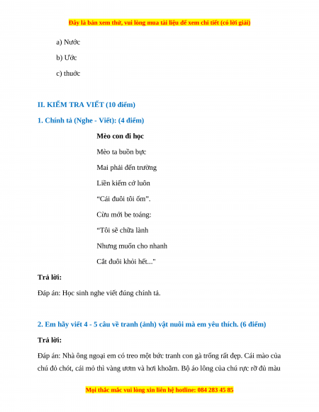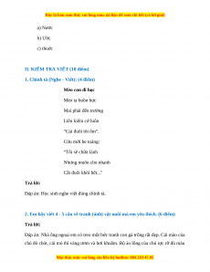 1. Chính tả (Nghe - Viết): (4 điểm) Mèo con đi học Mèo ta buồn bực Mai phải đến trường Liền kiếm cớ luôn “Cái đuôi tôi ốm”. Cừu mới be toáng: “Tôi sẽ chữa lành Nhưng muốn cho nhanh Cắt đuôi khỏi hết..." Trả lời: