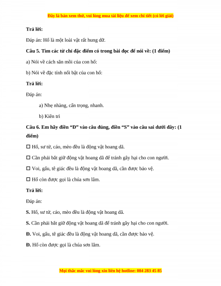 b) Nói về đặc tính nổi bật của con hổ: Trả lời: Đáp án: