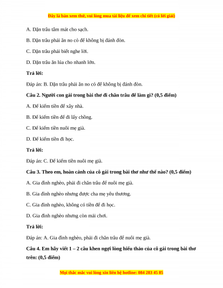 Câu 1. Trong bài thơ trên, cô gái dặn trâu điều gì? (0,5 điểm)