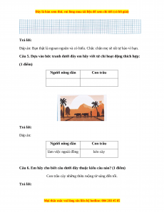 Câu 5. Dựa vào bức tranh dưới đây em hãy viết từ chỉ hoạt động thích hợp: (1 điểm) Người nông dân Con trâu Trả lời: Đáp án: Người nông dân Con trâu làm việc ngoài đồng kéo cày