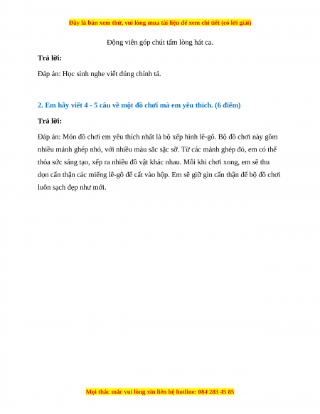 2. Em hãy viết 4 - 5 câu về một đồ chơi mà em yêu thích. (6 điểm)