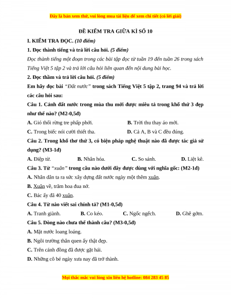 Đề thi giữa kì 2 Tiếng Việt lớp 5 năm 2023 (Đề 10)