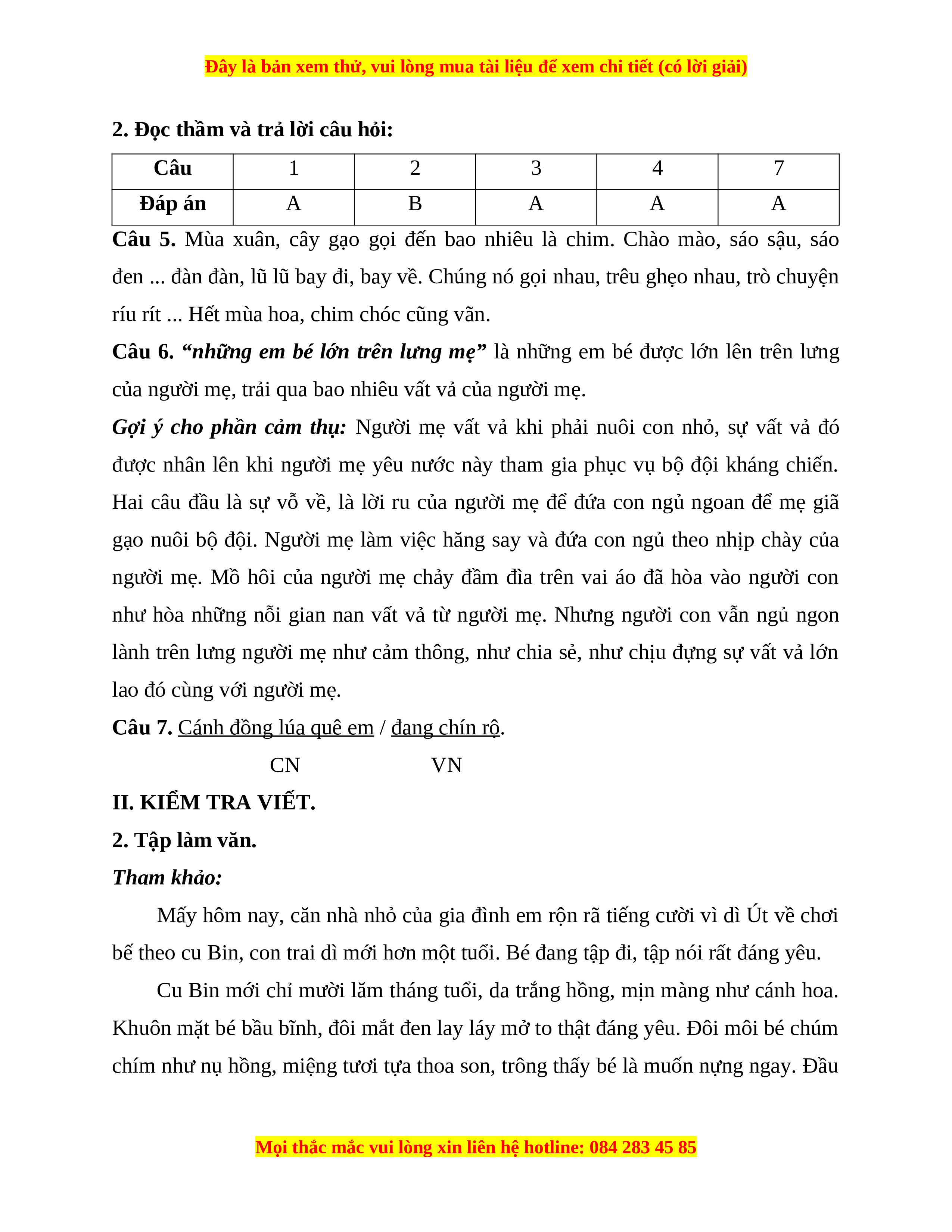 2. Đọc thầm và trả lời câu hỏi: Câu 1 2 3 4 7 Đáp án A B A A A