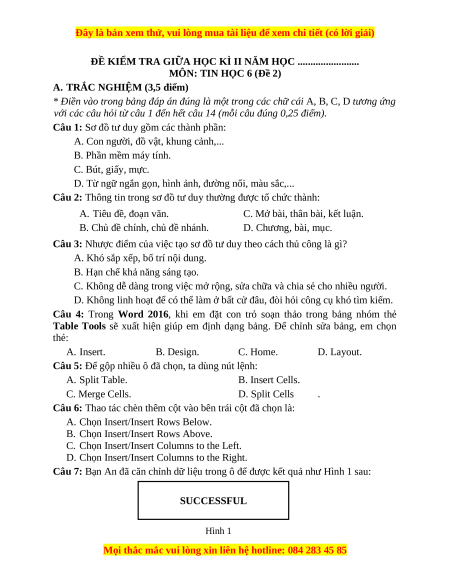 Câu 7: Bạn An đã căn chỉnh dữ liệu trong ô để được kết quả như Hình 1 sau: SUCCESSFUL Hình 1
