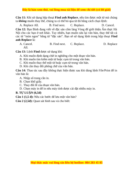 Câu 14: Thao tác sau đây không thực hiện được sau khi dùng lệnh File/Print để in văn bản là: A. Nhập số trang cần in. B. Chọn khổ giấy.