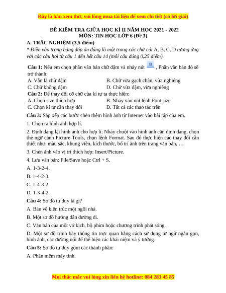 MÔN: TIN HỌC LỚP 6 (Đề 3)