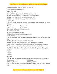 Câu 7: Để gõ dấu huyền, sắc, hỏi, ngã, nặng theo kiểu Telex tương ứng với những phím nào? A. f, s, j, r, x B. s, f, r, j, x C. f, s, r, x, j D. s, f, x, r, j