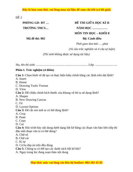 - Tailieugiaovien.com.vn giới thiệu bộ 4 đề giữa kì 2 gồm đầy đủ ma trận và lời giải chi tiết môn Tin học 8 Cánh diều mới nhất năm 2023-2024 nhằm giúp Giáo viên có thêm tài liệu tham khảo ra đề thi Tin học lớp 8.