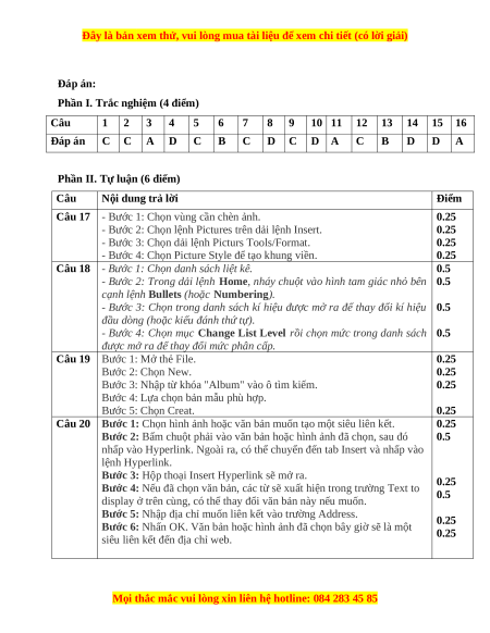 Câu 17: (1 điểm) Em hãy nêu các bước chèn một ảnh trong máy tính vào một văn