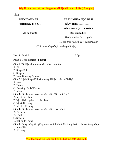 MÔN TIN HỌC – KHỐI 8 Mã đề thi: 003 Bộ: Cánh diều