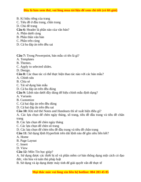 Câu 6: Header là phần nào của văn bản? A. Phần dưới cùng B. Phần thân văn bản C. Phần trên cùng