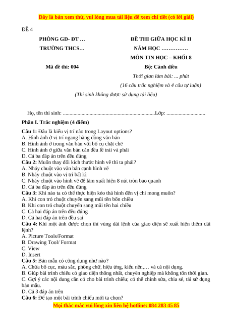 MÔN TIN HỌC – KHỐI 8 Mã đề thi: 004 Bộ: Cánh diều