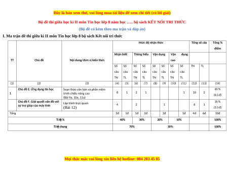 I. Ma trận đề thi giữa kì II môn Tin học lớp 8 bộ sách Kết nối tri thức
