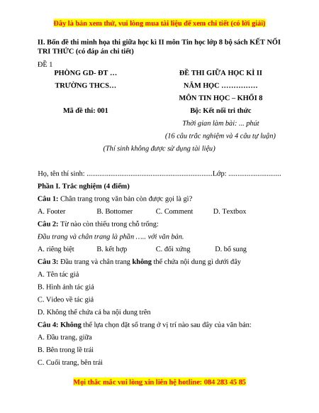 II. Bốn đề thi minh họa thi giữa học kì II môn Tin học lớp 8 bộ sách KẾT NỐI