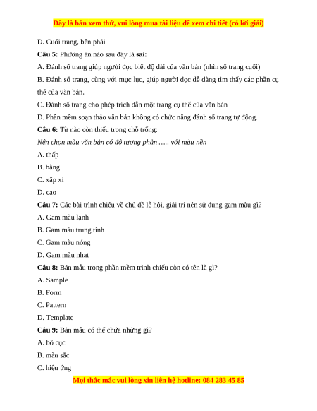 Câu 4: Không thể lựa chọn đặt số trang ở vị trí nào sau đây của văn bản: A. Đầu trang, giữa B. Bên trong lề trái C. Cuối trang, bên trái