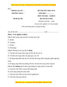 Câu 1: Đầu trang trong văn bản còn được gọi là gì? A. Border B. Toppage C. Header D. Homepage
