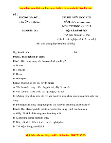 MÔN TIN HỌC – KHỐI 8 Mã đề thi: 002