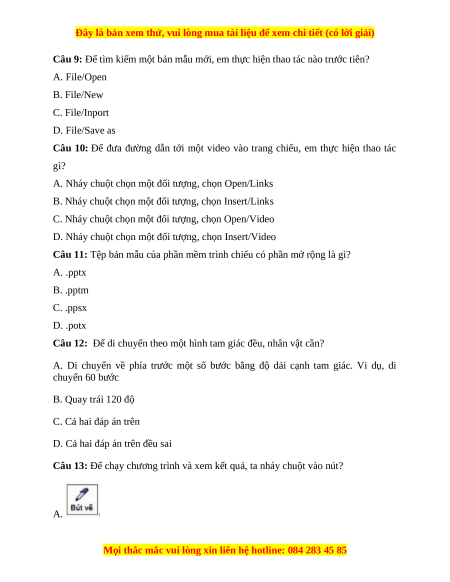 Câu 9: Để tìm kiếm một bản mẫu mới, em thực hiện thao tác nào trước tiên? A. File/Open B. File/New C. File/Inport D. File/Save as