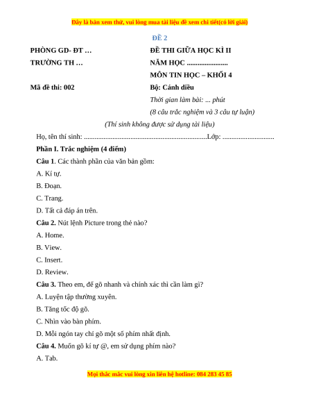 MÔN TIN HỌC – KHỐI 4 Mã đề thi: 002 Bộ: Cánh diều