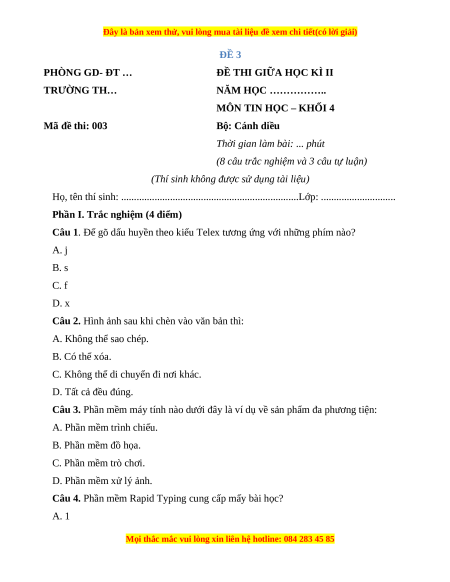 - Tailieugiaovien.com.vn giới thiệu 4 đề giữa kì 2 gồm đầy đủ ma trận và lời giải chi tiết môn Tin học lớp 4 Cánh diều mới nhất năm 2024 nhằm giúp Giáo viên có thêm tài liệu tham khảo ra đề thi Tin học lớp 4.