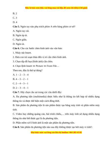 Câu 5. Ngón tay nào phụ trách phím A trên hàng phím cơ sở? A. Ngón tay cái. B. Ngón áp út. C. Ngón giữa. D. Ngón út.